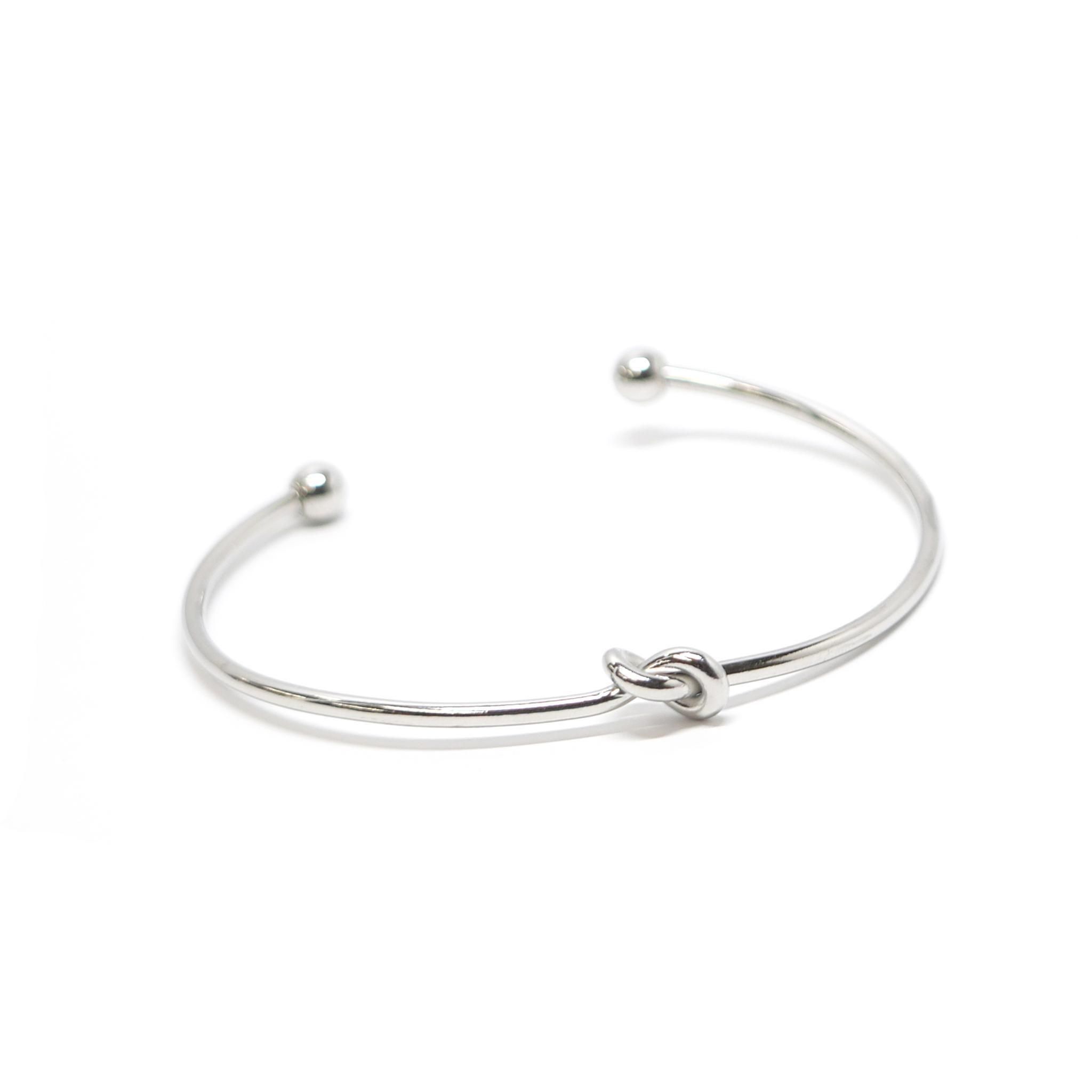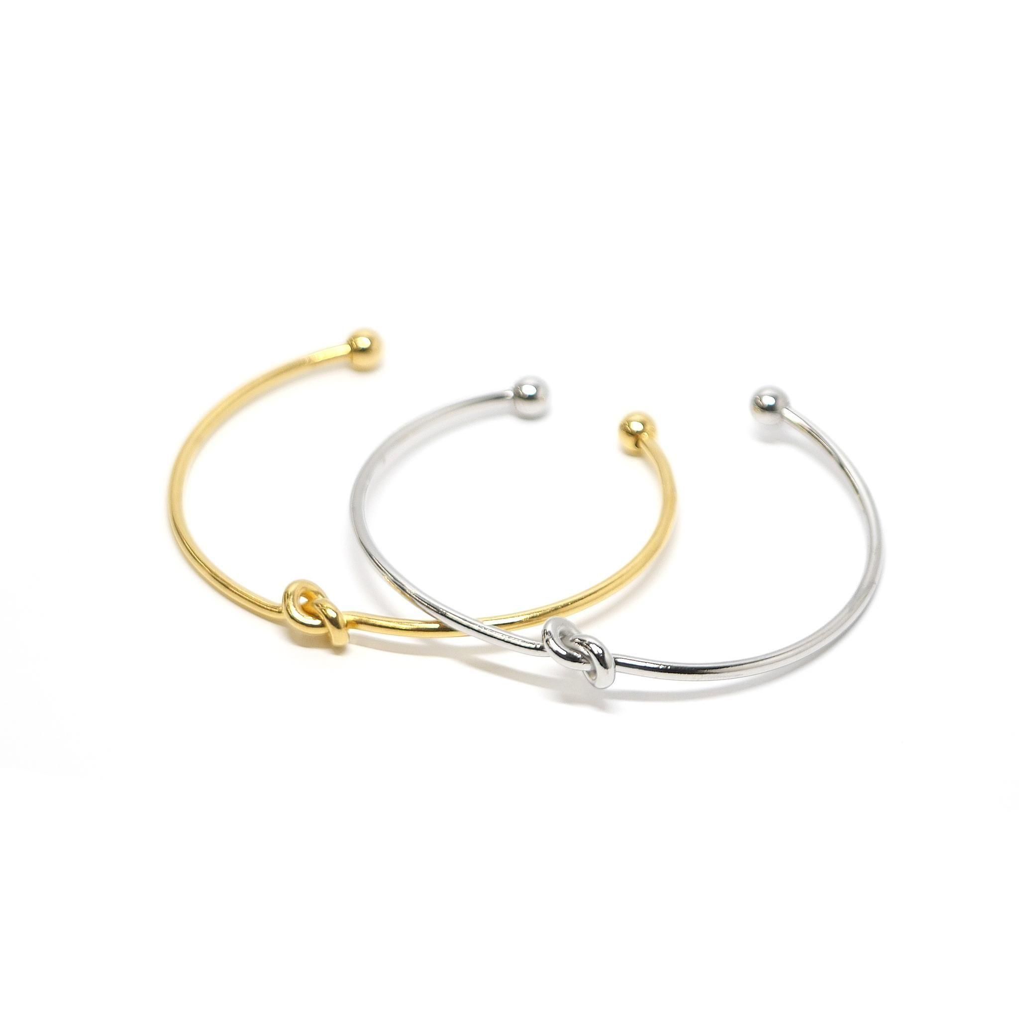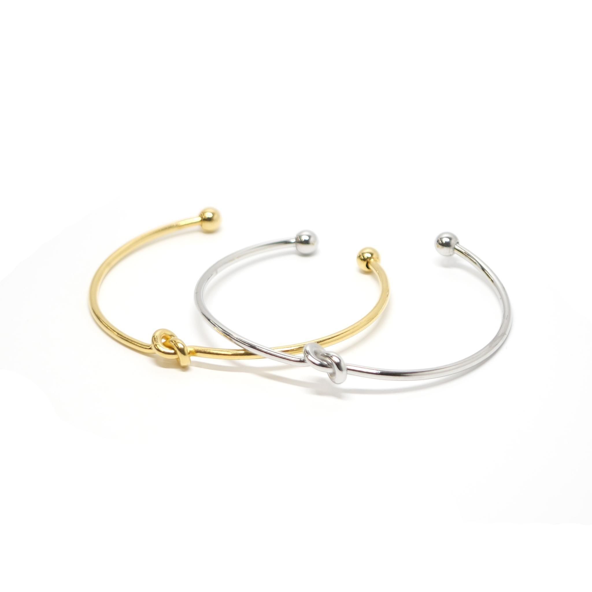 シンプルで洗練されたノットデザインのサージカルステンレス製バングル。細身のラインに結び目をあしらったデザインは、ミニマルながらもさりげない個性を演出します。チャームや装飾をつけても落ちにくい役割をする約6mmボールが付いております。
