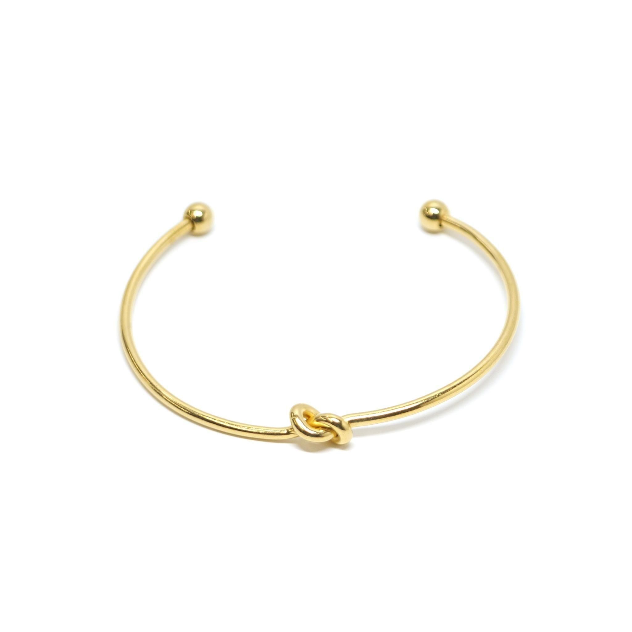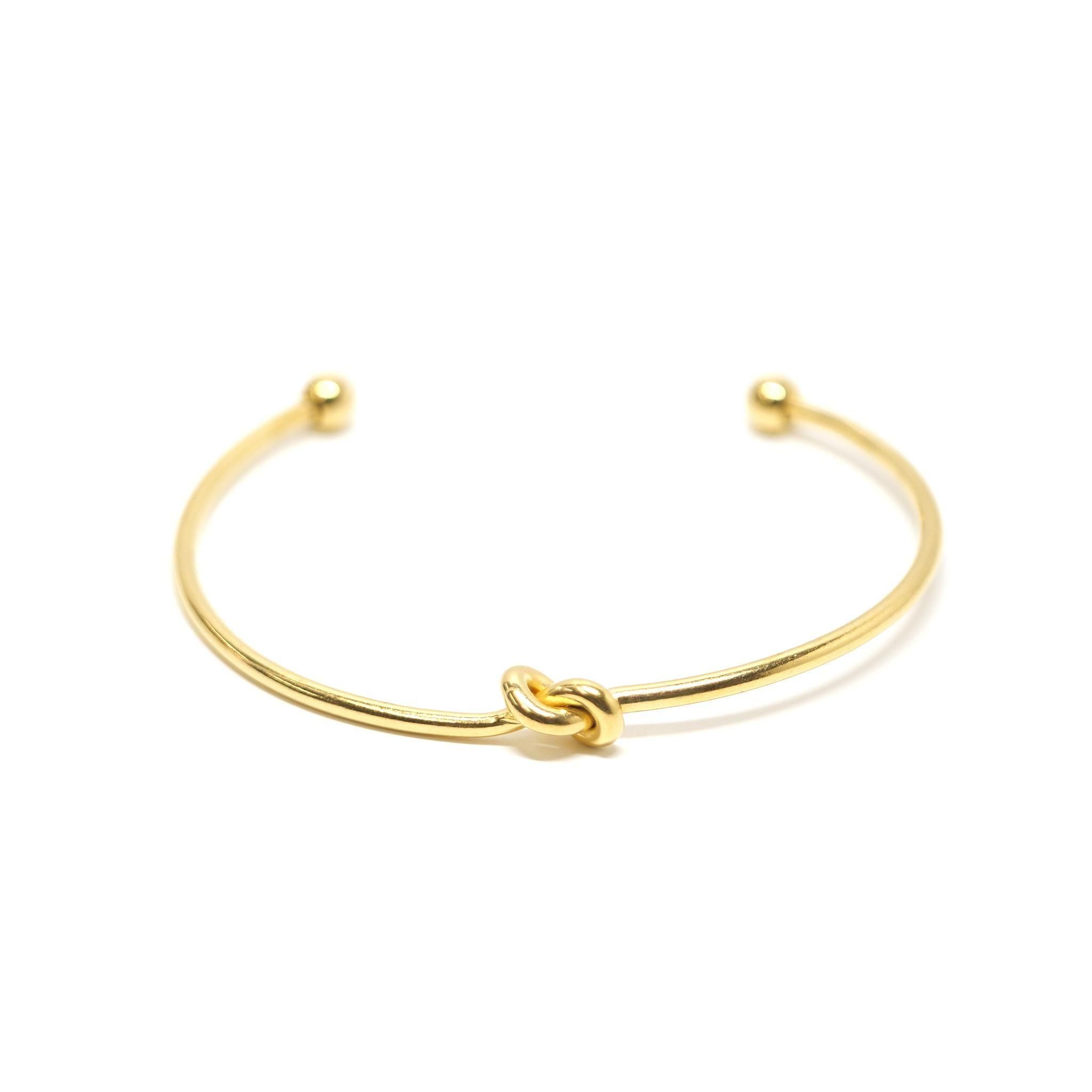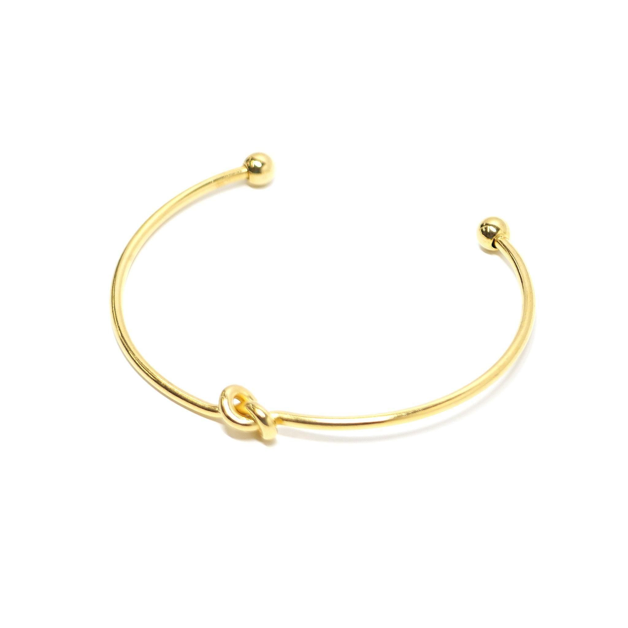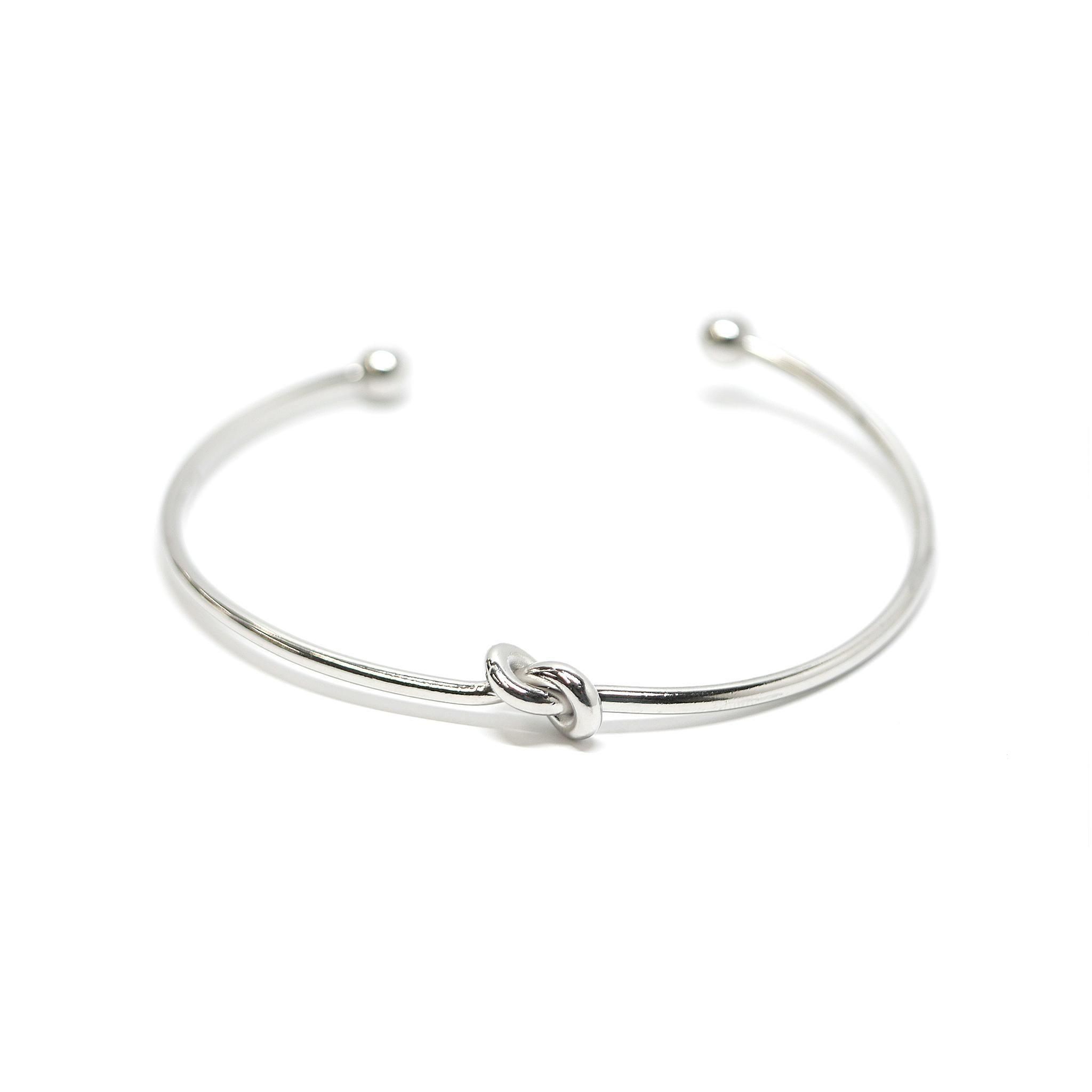 シンプルで洗練されたノットデザインのサージカルステンレス製バングル。細身のラインに結び目をあしらったデザインは、ミニマルながらもさりげない個性を演出します。チャームや装飾をつけても落ちにくい役割をする約6mmボールが付いております。