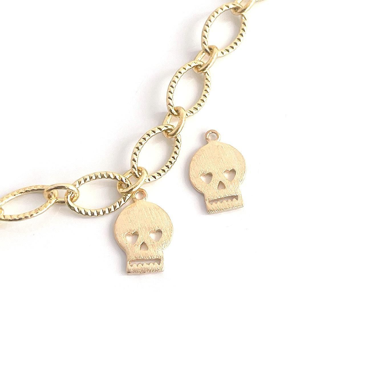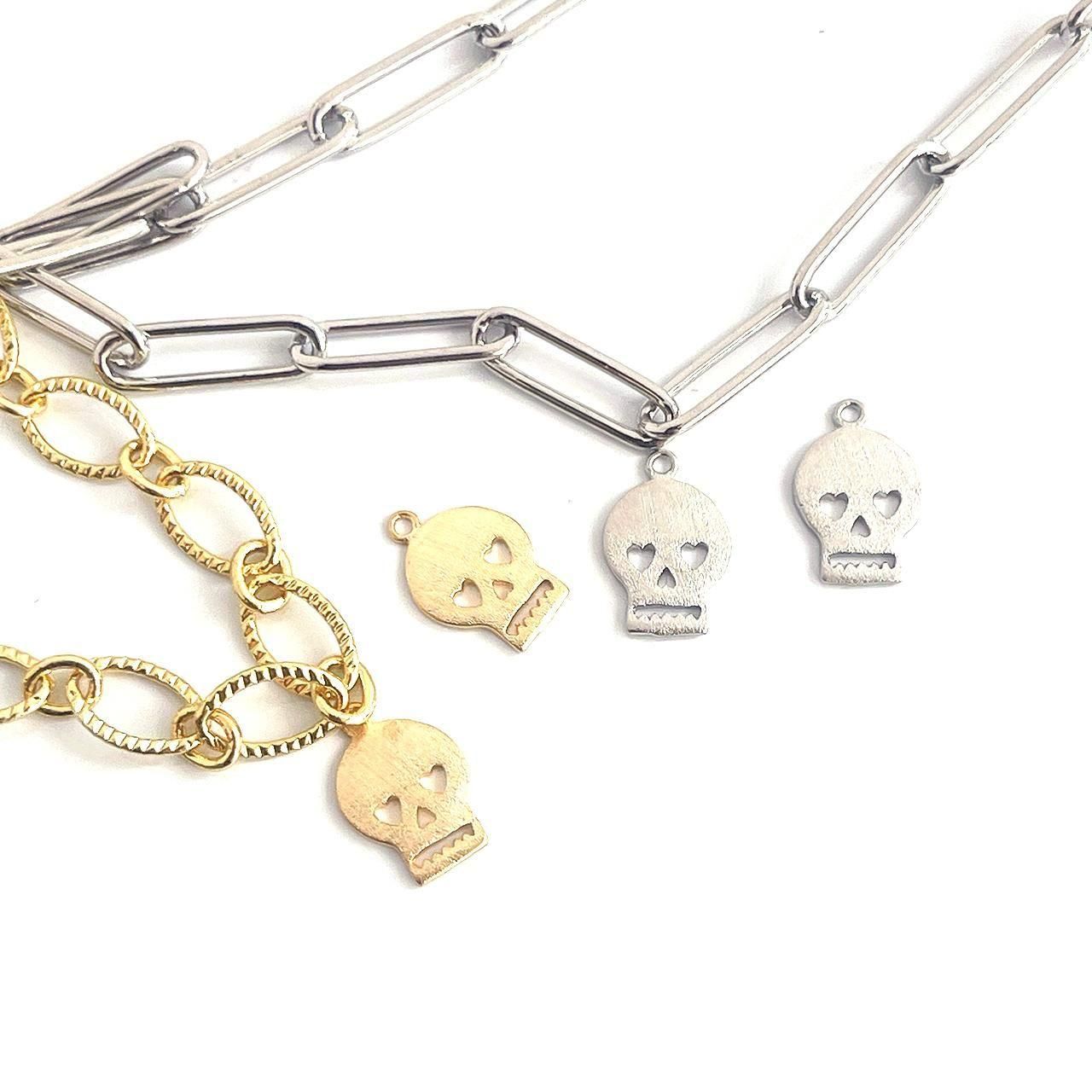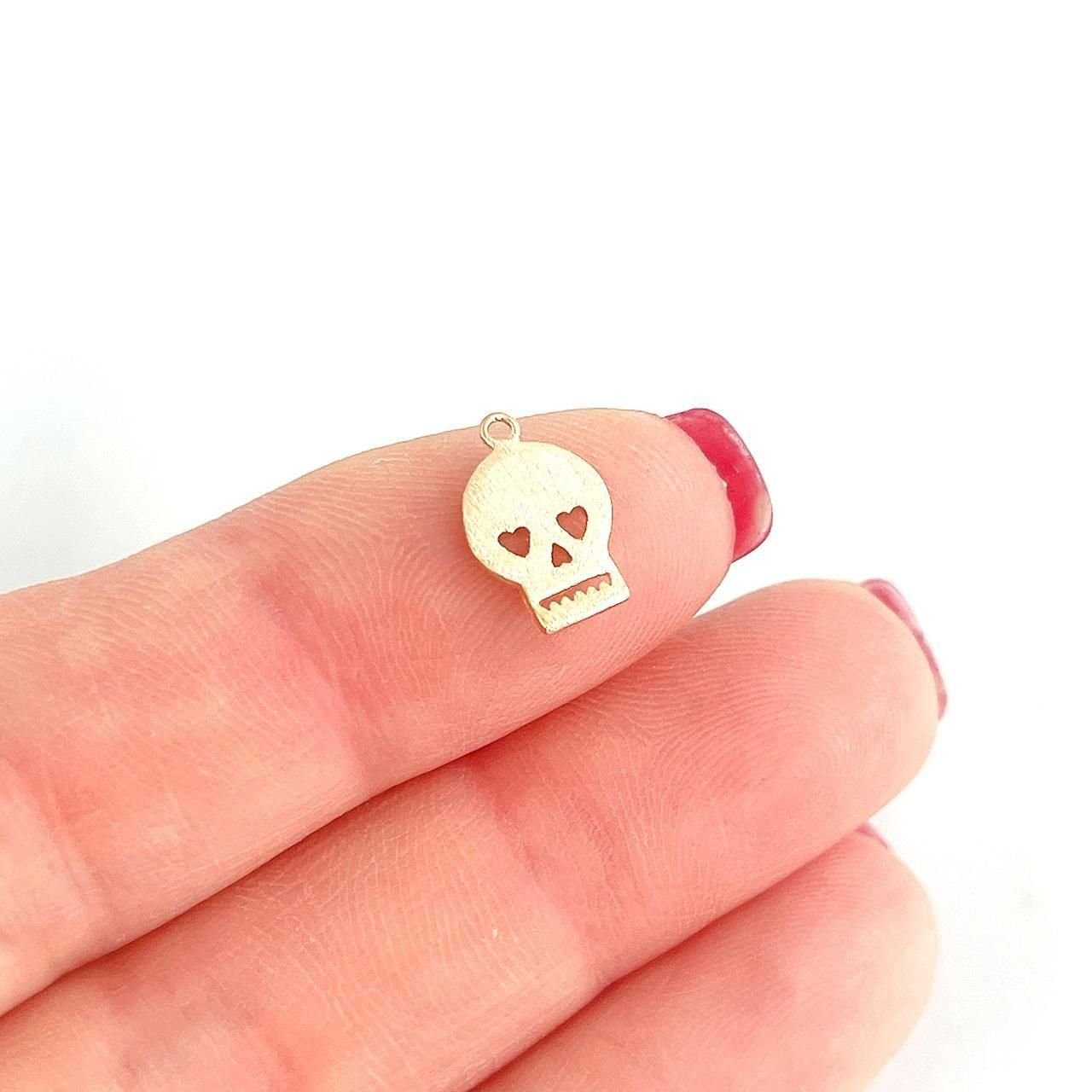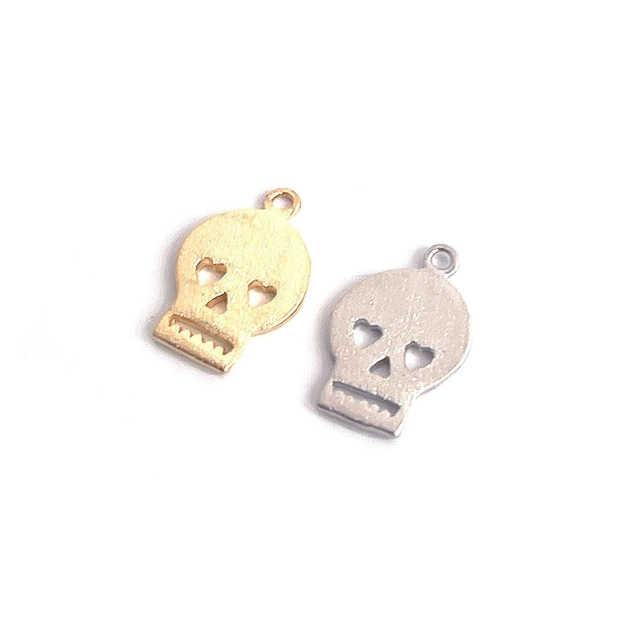 ハート型の目がポイントになった、遊び心ある質感あるスカルモチーフチャーム。ゴールドとシルバーの2カラー展開で、ブレスレットやネックレス、ピアスなどのワンポイントにおすすめです。ハロウィンのアクセサリー制作やロックテイストのデザインにもぴったりです。(開閉式カンはハンドメイド工具をご使用ください。)