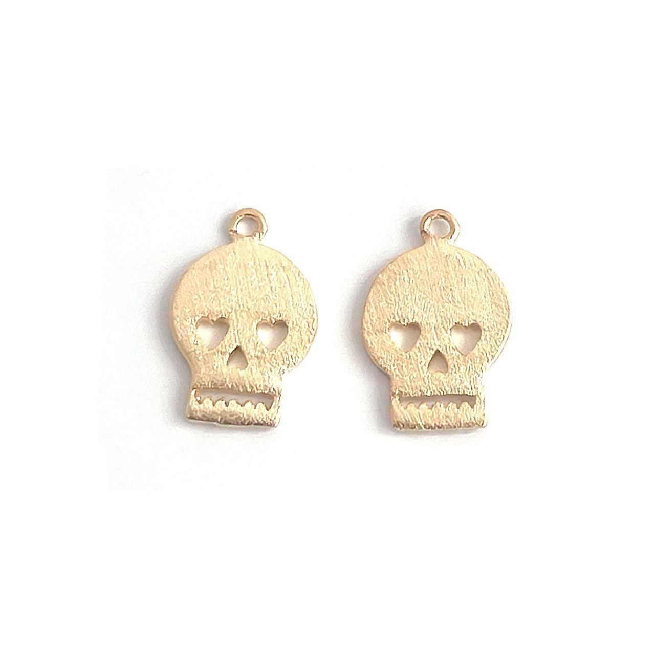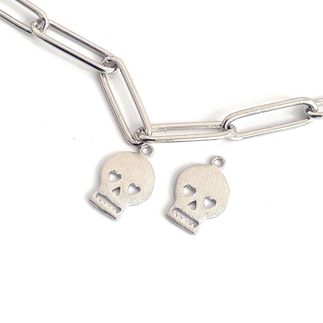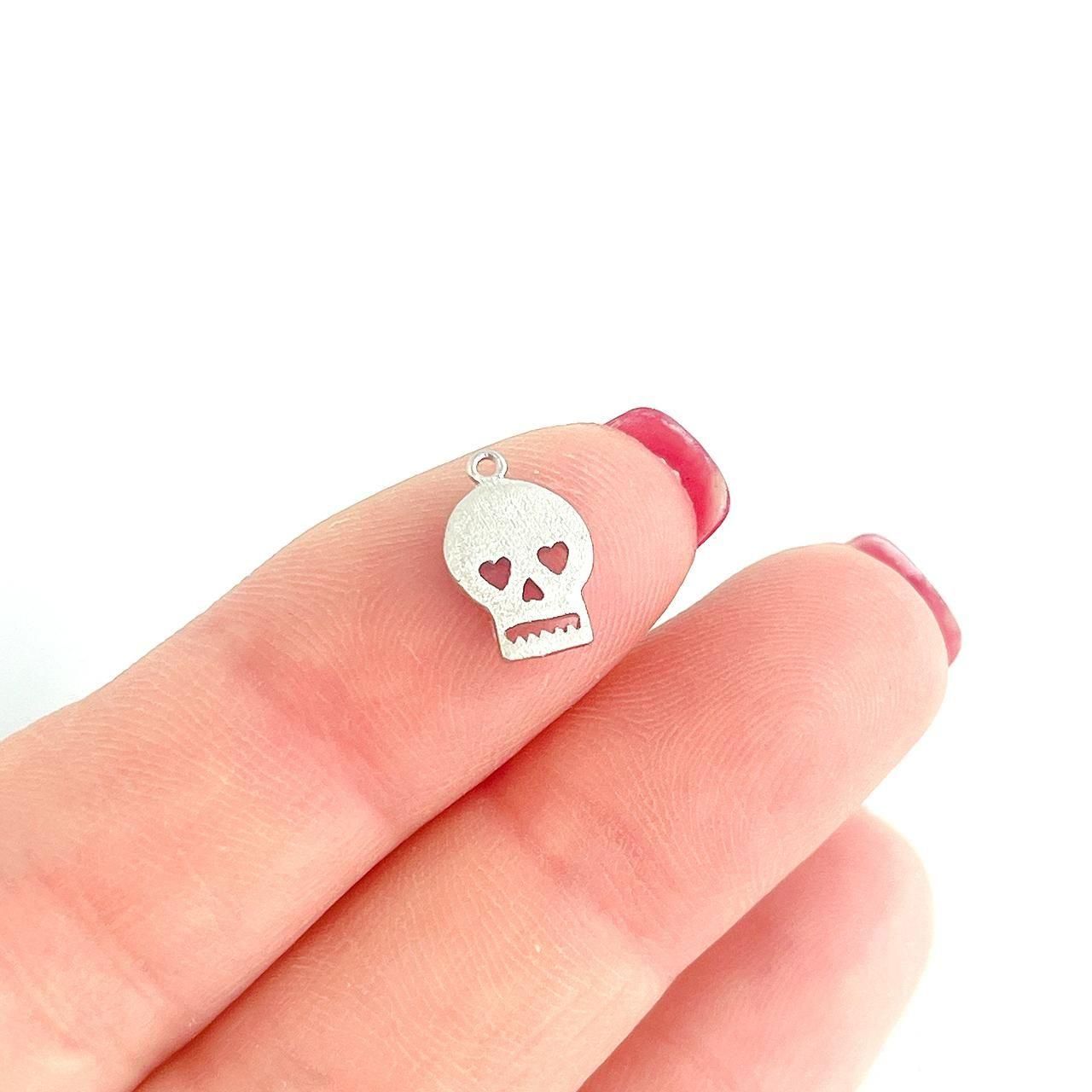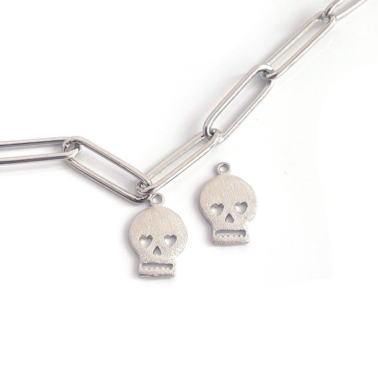 ハート型の目がポイントになった、遊び心ある質感あるスカルモチーフチャーム。ゴールドとシルバーの2カラー展開で、ブレスレットやネックレス、ピアスなどのワンポイントにおすすめです。ハロウィンのアクセサリー制作やロックテイストのデザインにもぴったりです。(開閉式カンはハンドメイド工具をご使用ください。)