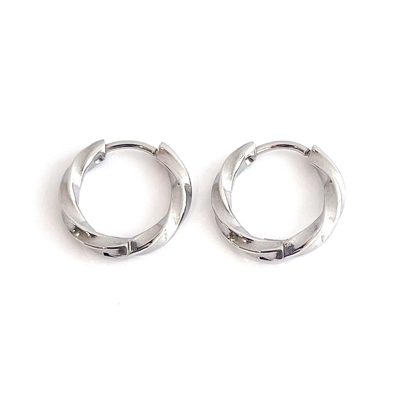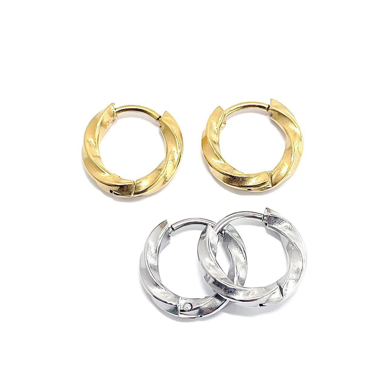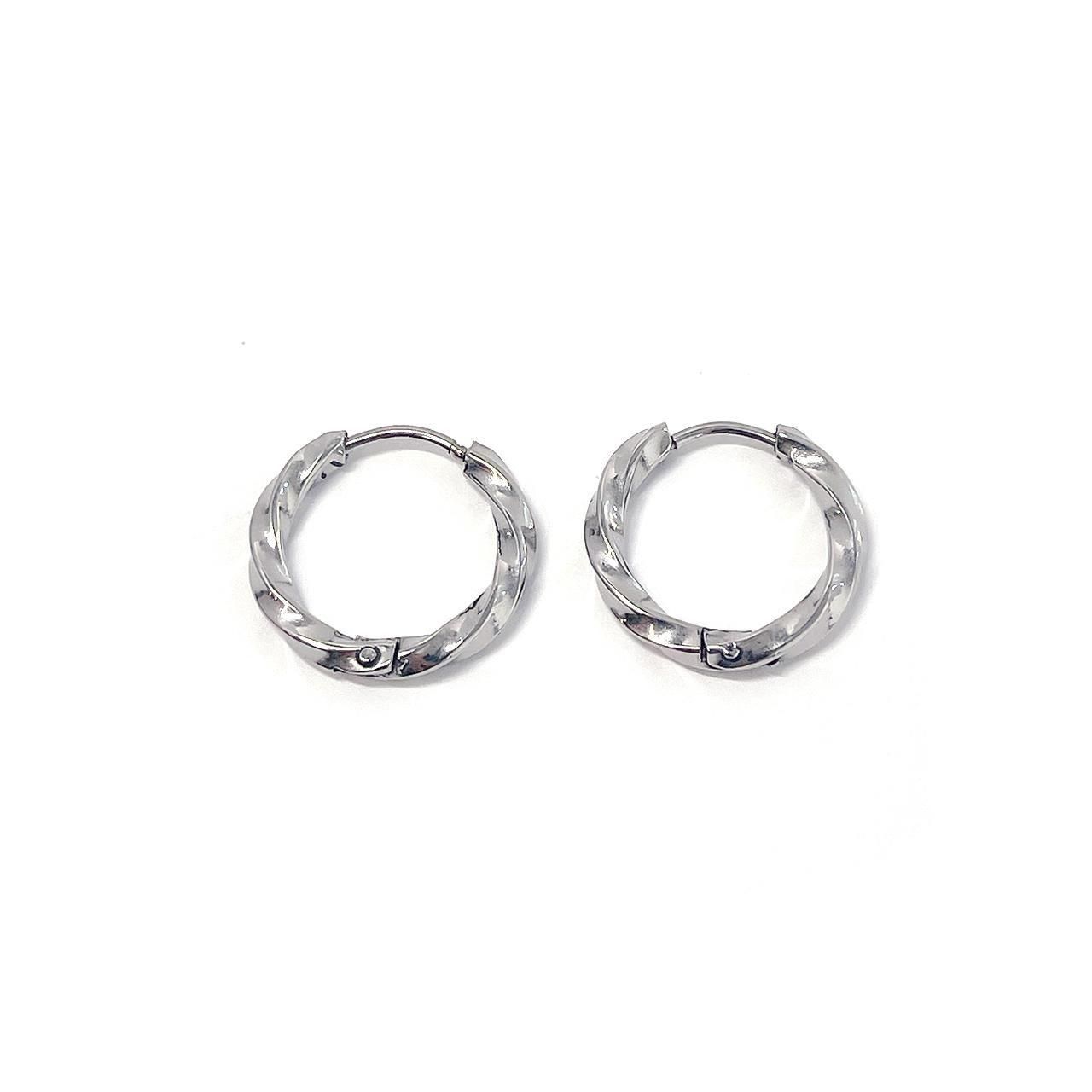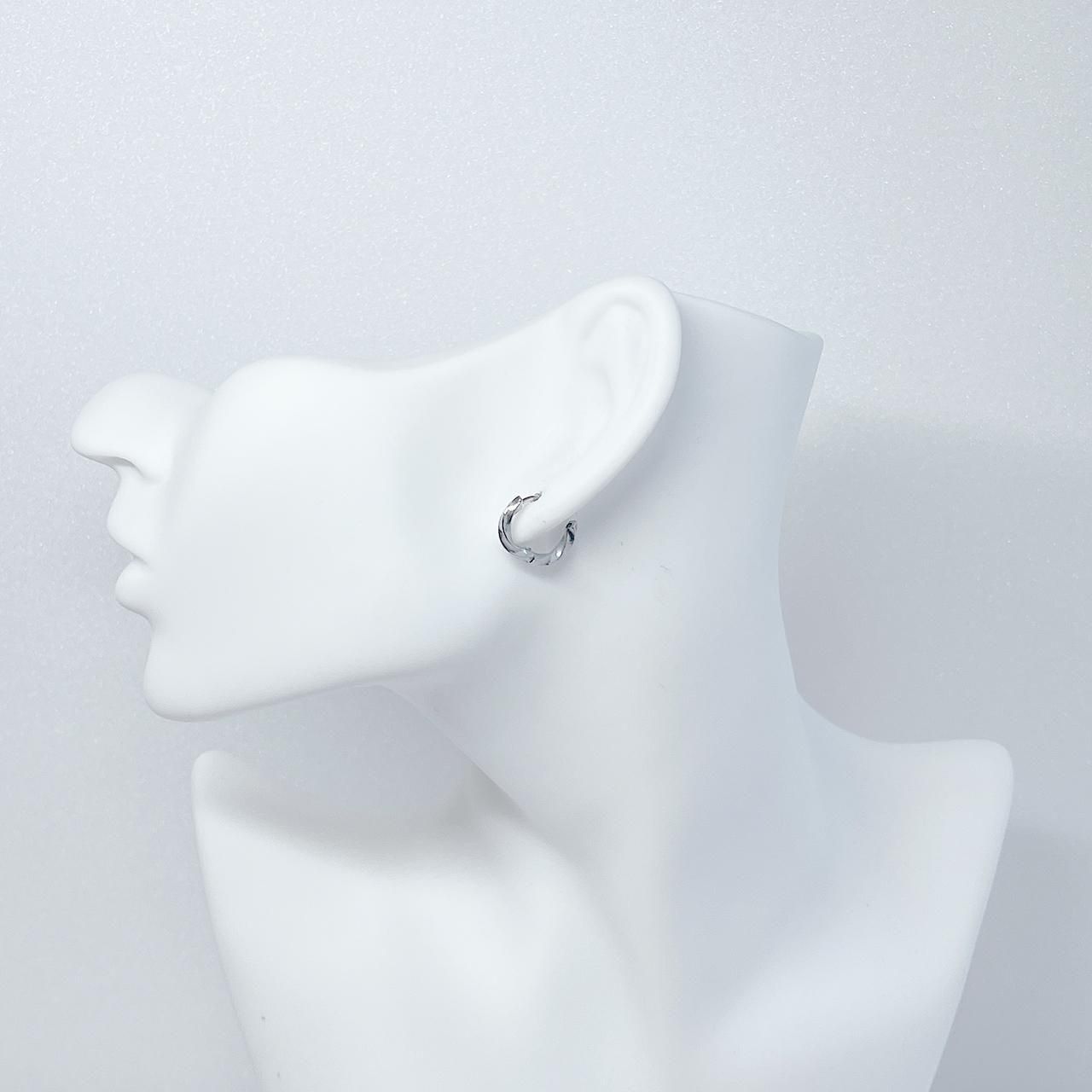 立体感のあるひねりデザインが印象的な、サージカルステンレス製フープピアス。程よい厚み(線径 約2.5mm)で存在感がありながら、耳元にすっきりと馴染む洗練されたフォルムです。