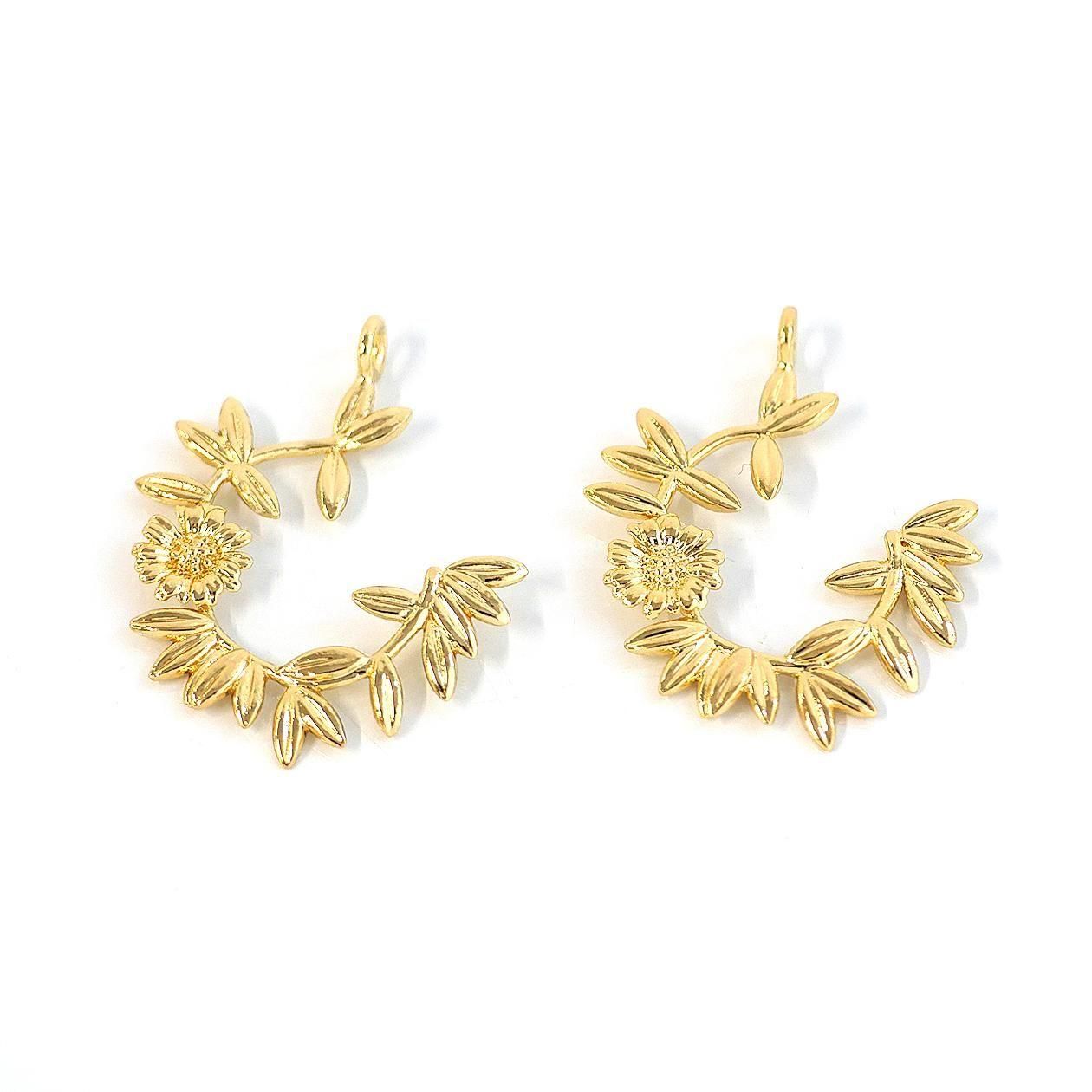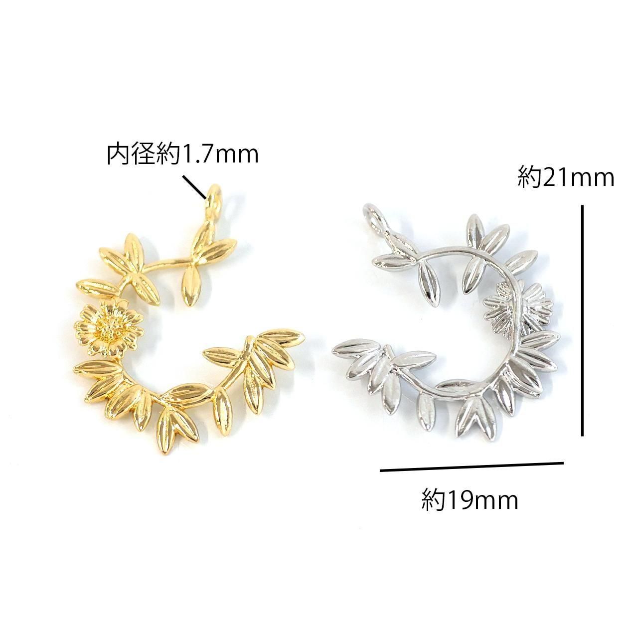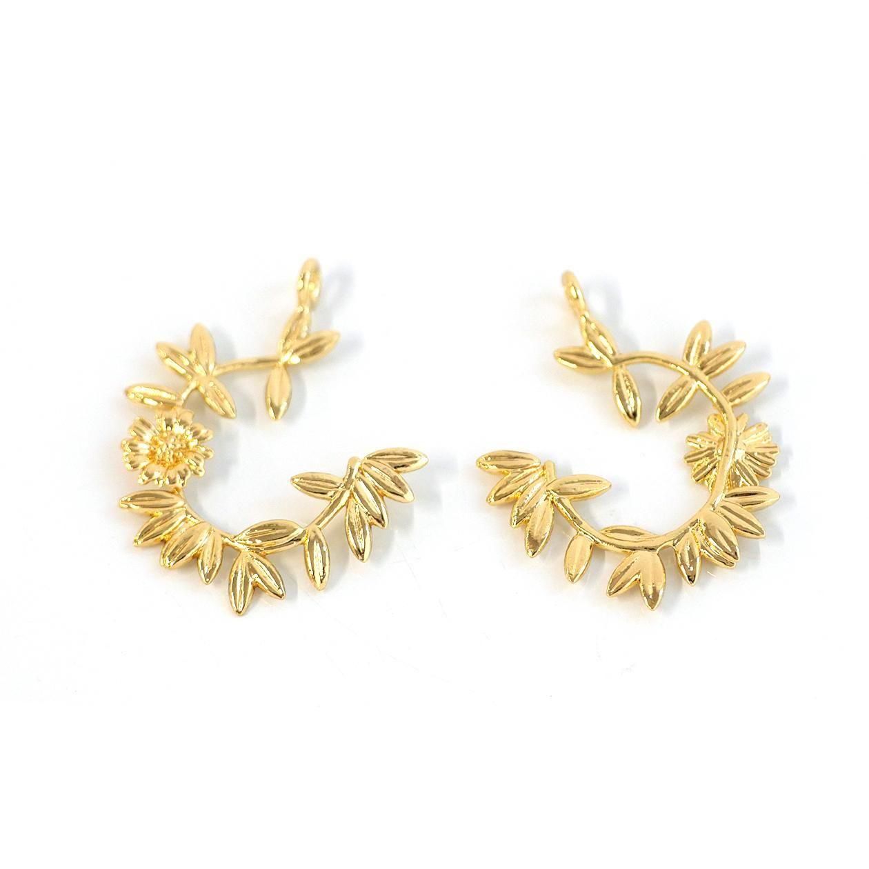 小花と葉がリース状に連なった、繊細で上品な印象のチャームパーツです。立体的な小花の造形と、程よい抜け感のあるオープンデザインが、アクセサリーにナチュラルな華やかさをプラスしてくれます。真鍮素材にニッケルフリーメッキを施しており、金属アレルギーに配慮した仕上がり。ピアスやイヤリングの主役パーツとしてはもちろん、ネックレストップやバッグチャームのワンポイントにもおすすめです。