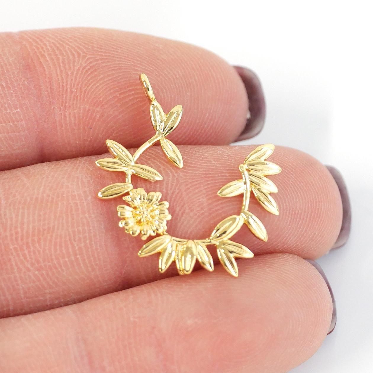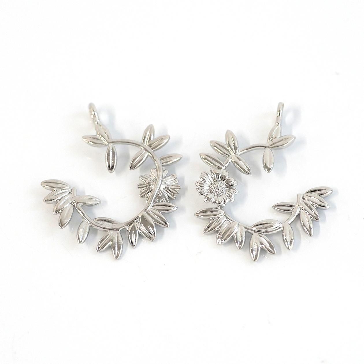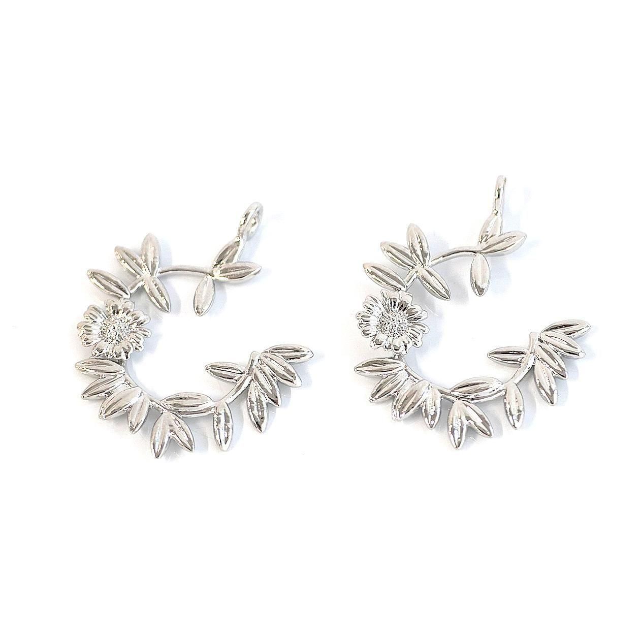 小花と葉がリース状に連なった、繊細で上品な印象のチャームパーツです。立体的な小花の造形と、程よい抜け感のあるオープンデザインが、アクセサリーにナチュラルな華やかさをプラスしてくれます。真鍮素材にニッケルフリーメッキを施しており、金属アレルギーに配慮した仕上がり。ピアスやイヤリングの主役パーツとしてはもちろん、ネックレストップやバッグチャームのワンポイントにもおすすめです。