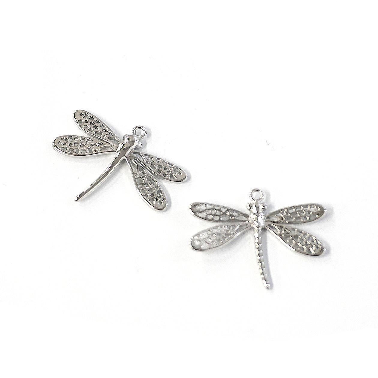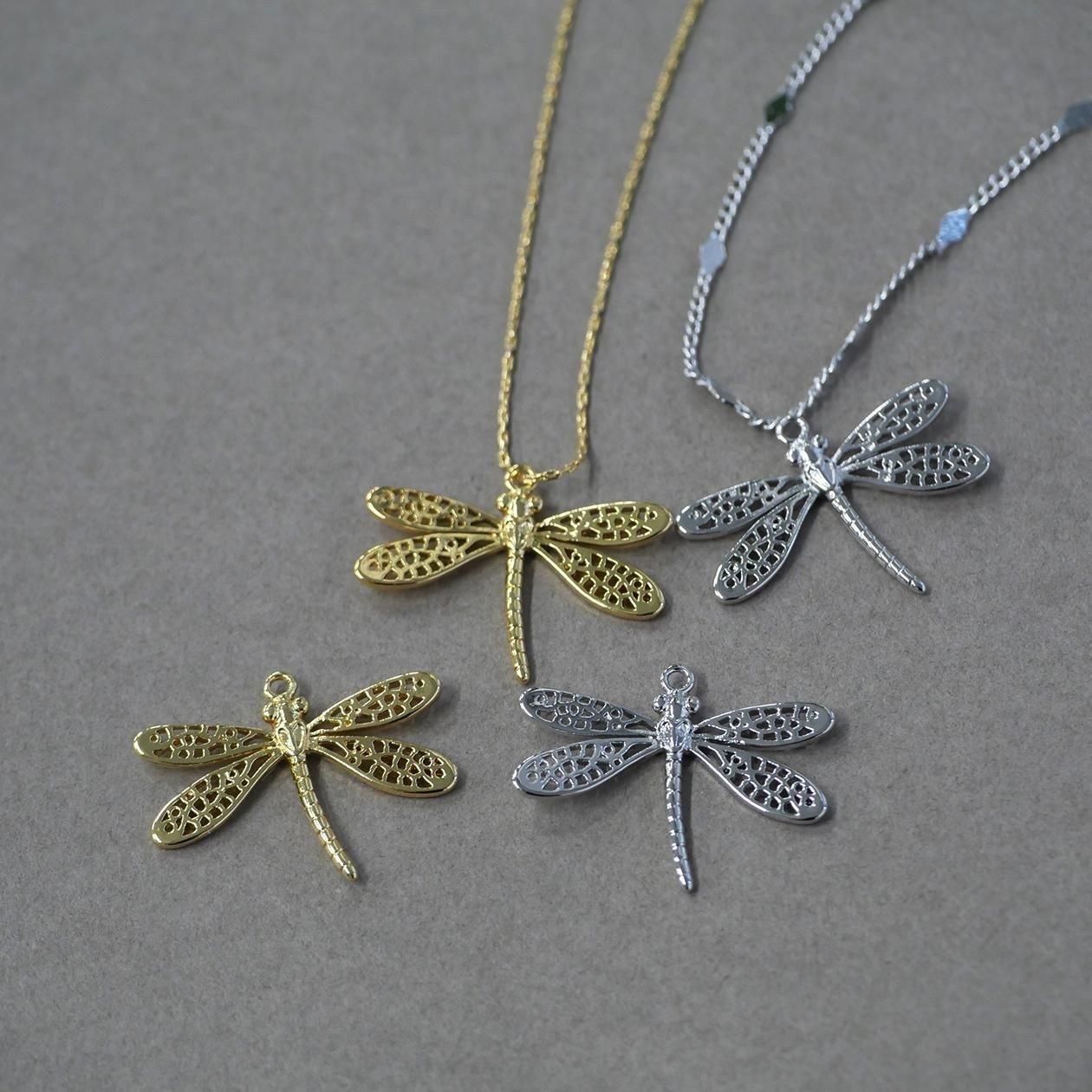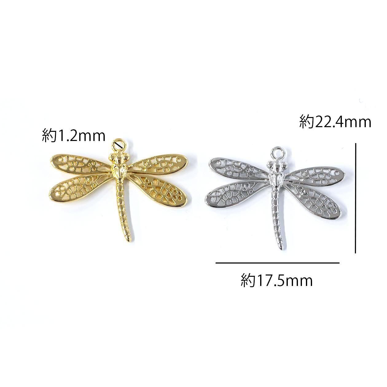 トンボの羽部分まで繊細に表現した光沢ゴールド、光沢シルバーのチャーム、ペンダントです。本体の上部にカン、チェーンを通せる穴があります。