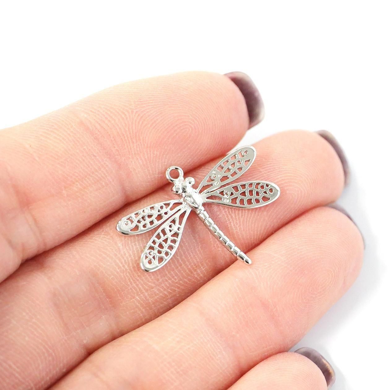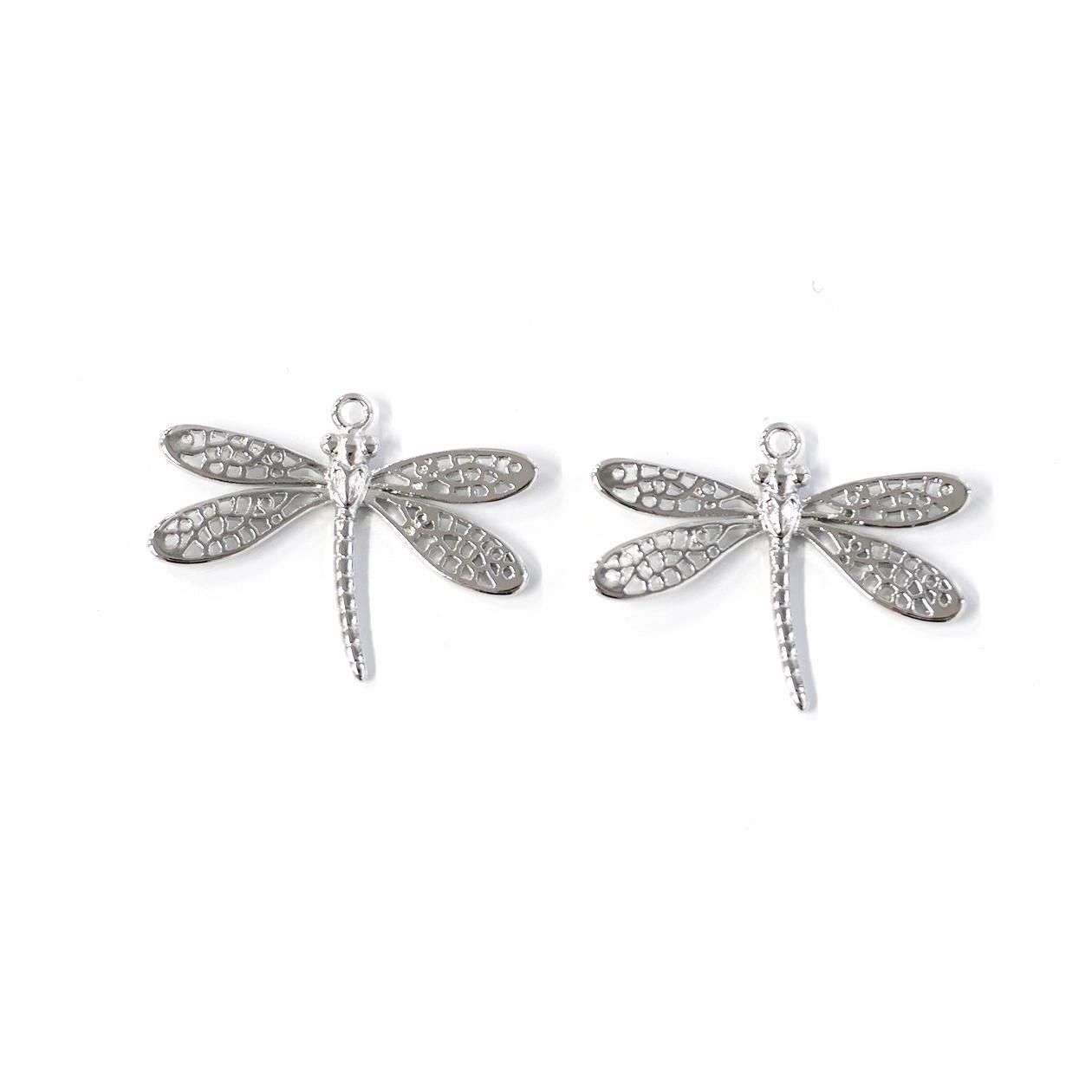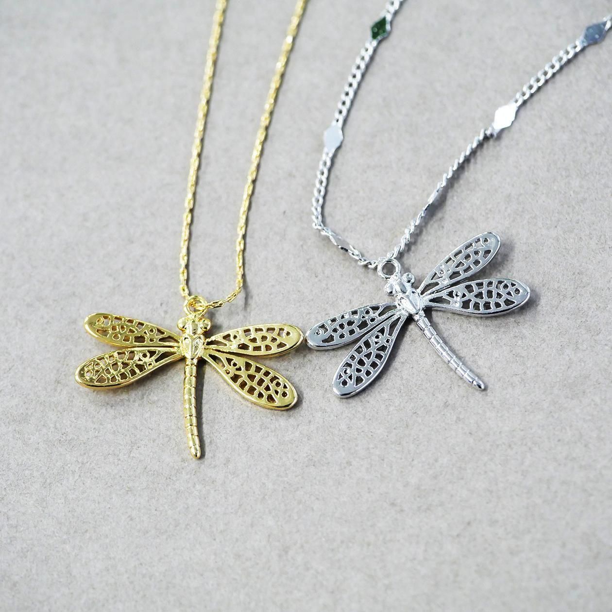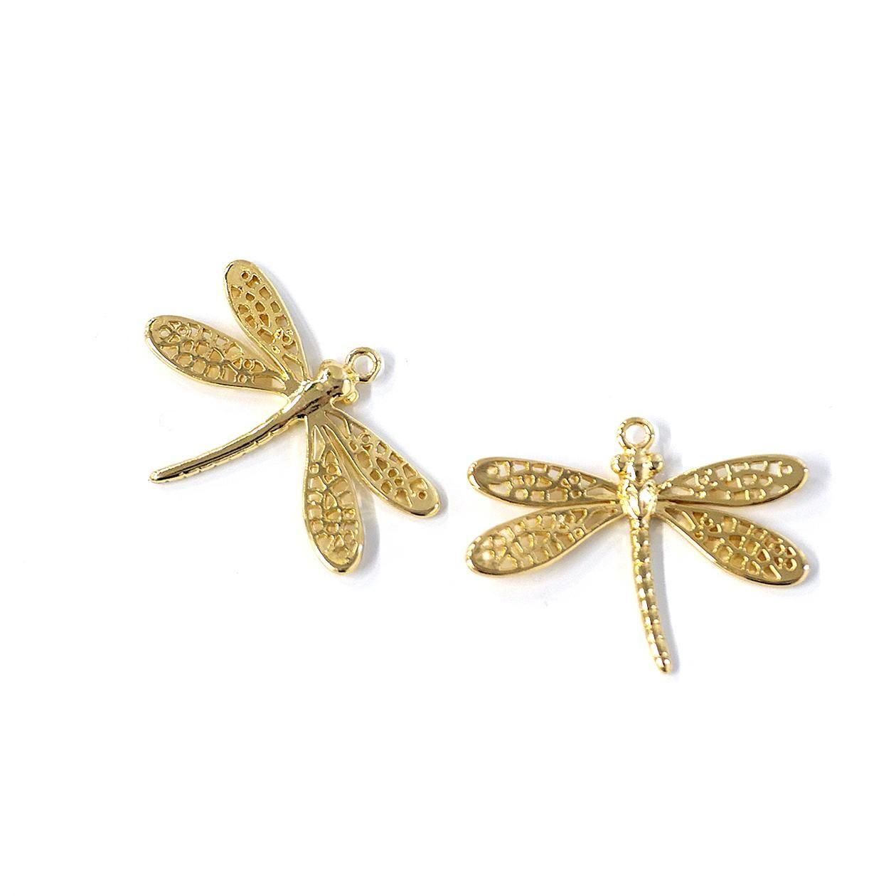 トンボの羽部分まで繊細に表現した光沢ゴールド、光沢シルバーのチャーム、ペンダントです。本体の上部にカン、チェーンを通せる穴があります。